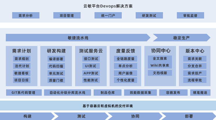 平臺設計上集需求管理、代碼管理、流水線構建、度量管理為一體,在金融行業強監管和管控的制約下,針對金融行業業務痛點,最大限度覆蓋金融研發的整個過程,腳踏實地將棘手問題化繁為簡,推動組織敏捷文化,小步快跑的落地Devops。